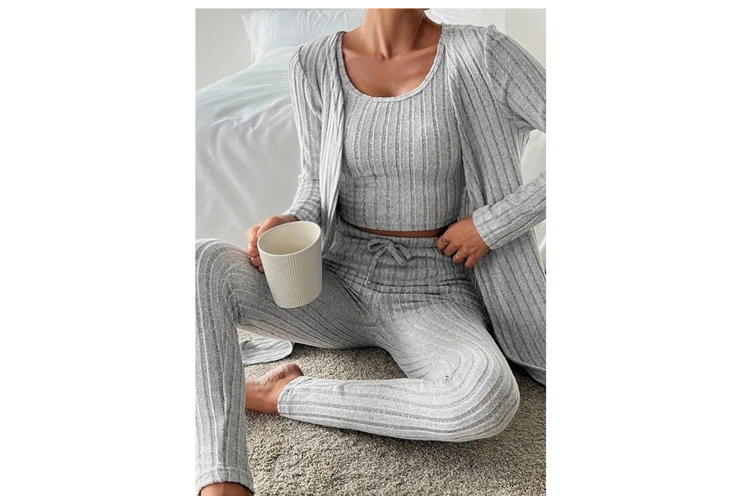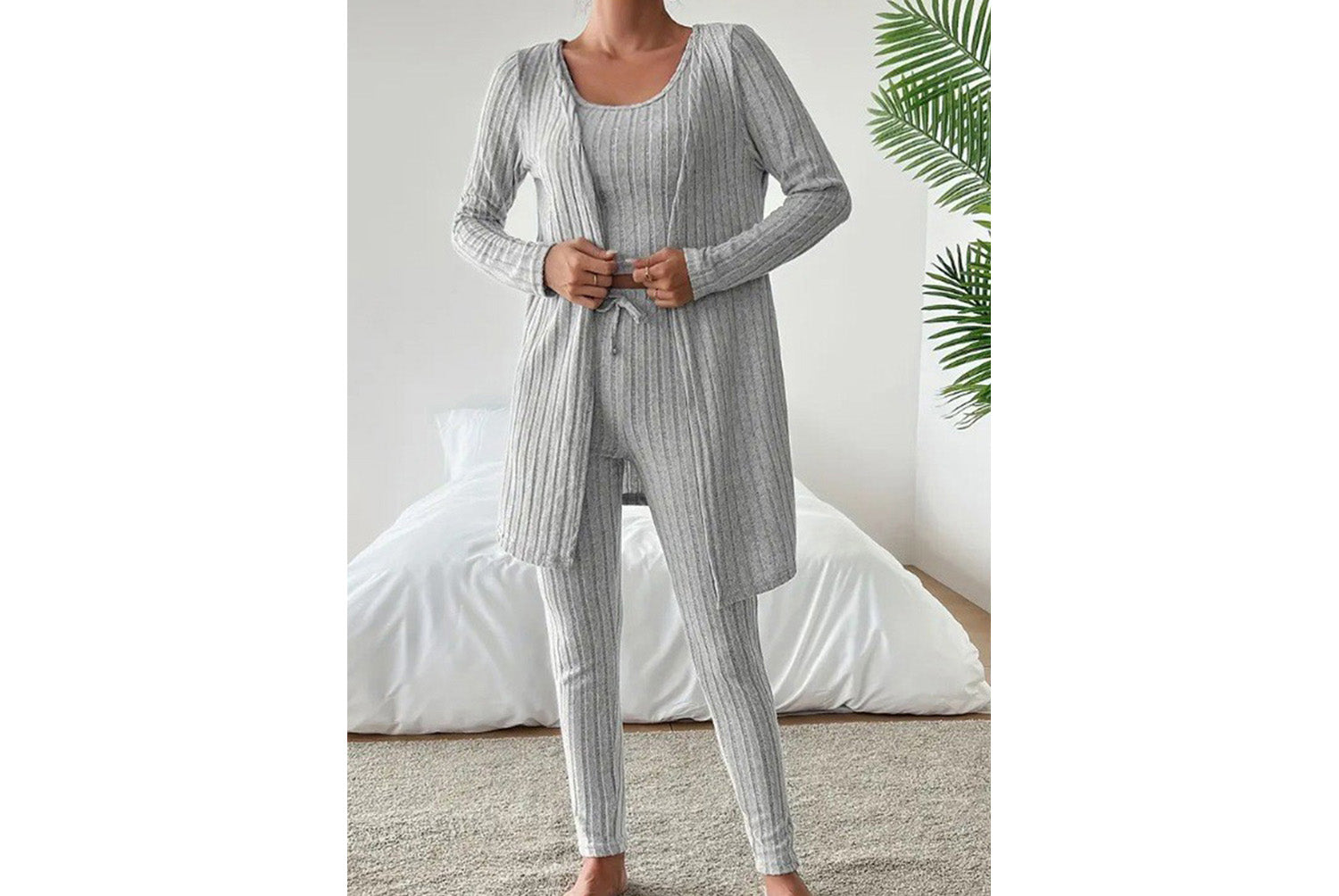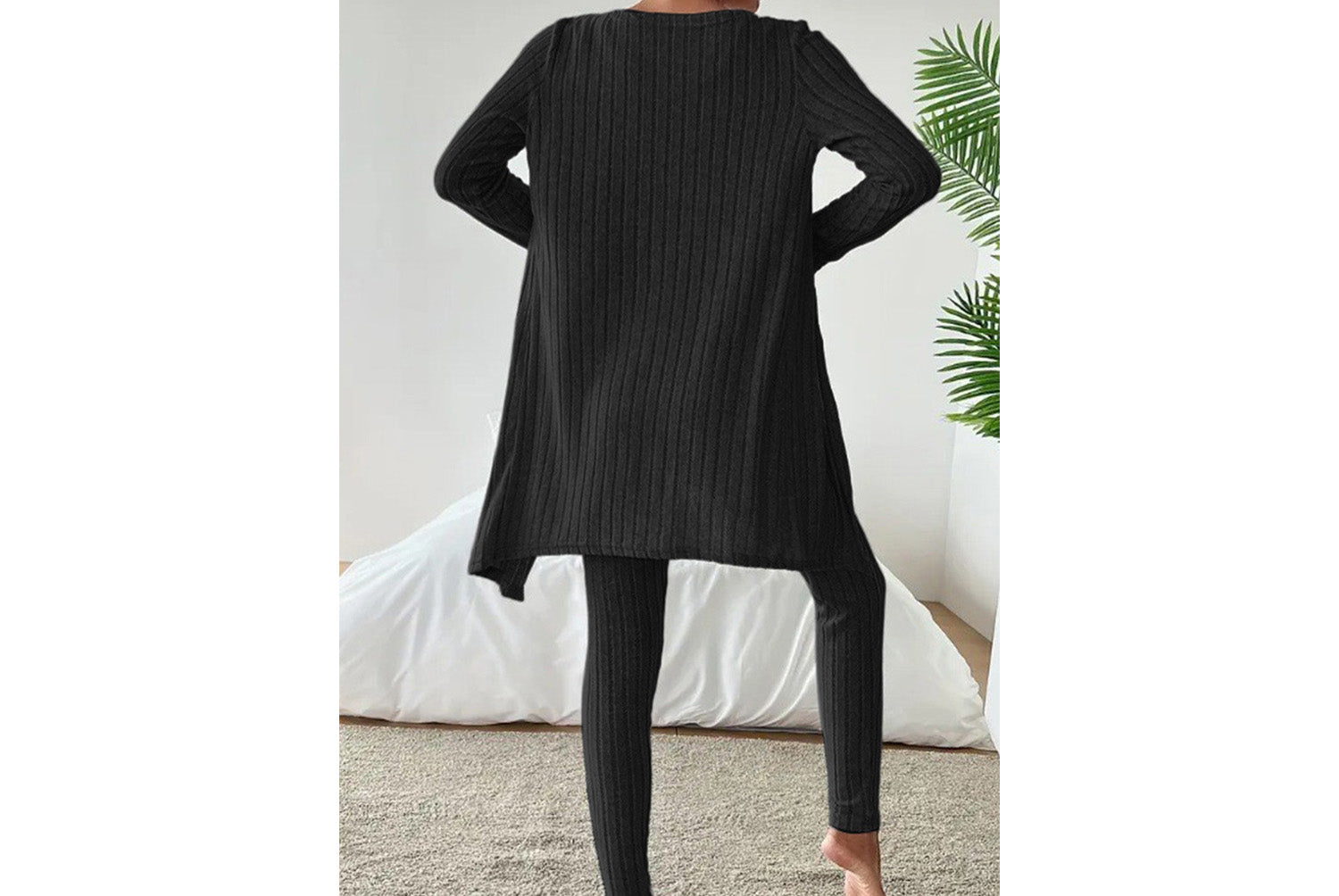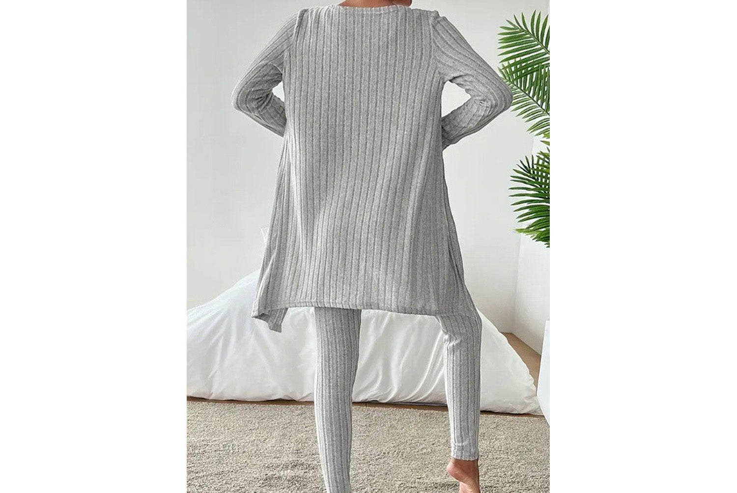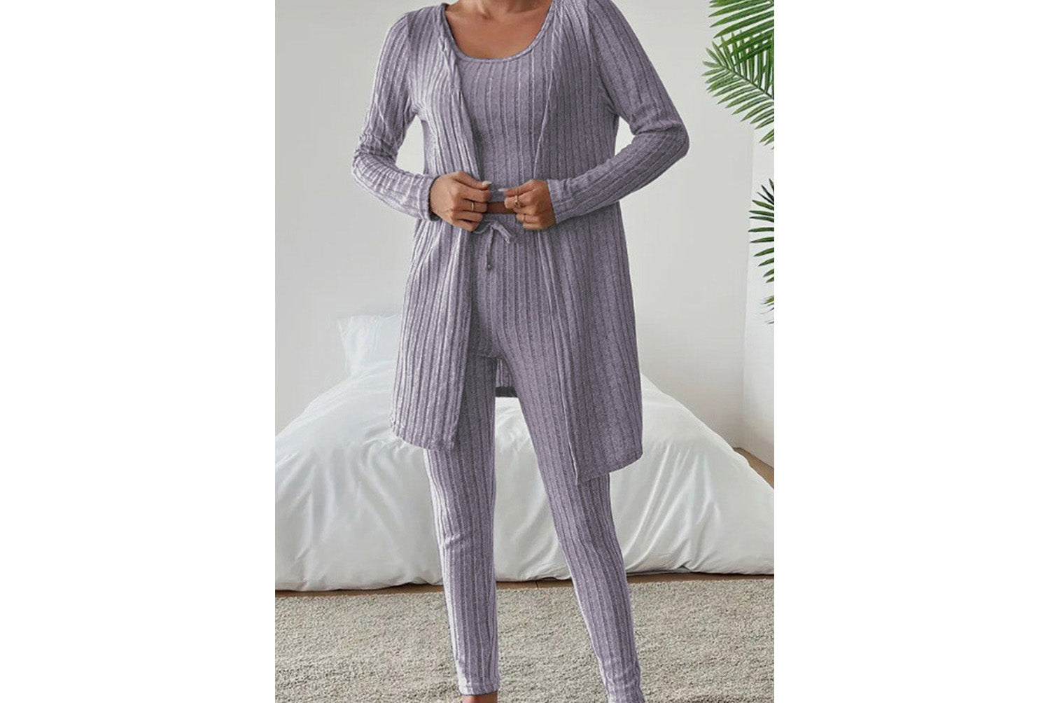 **Designed Round Neck Ribbed Casual Solid Color Women's Three-Piece Set**