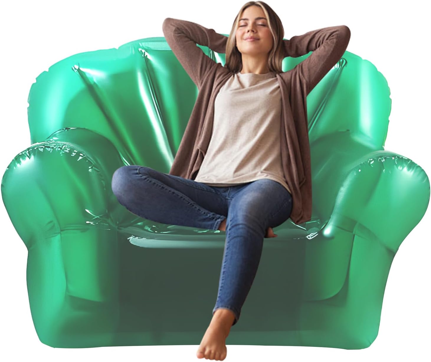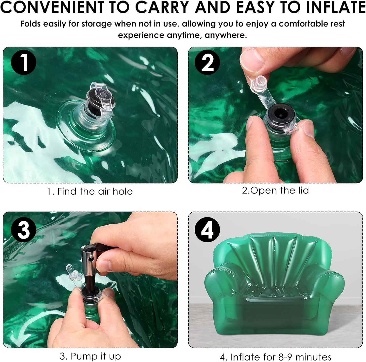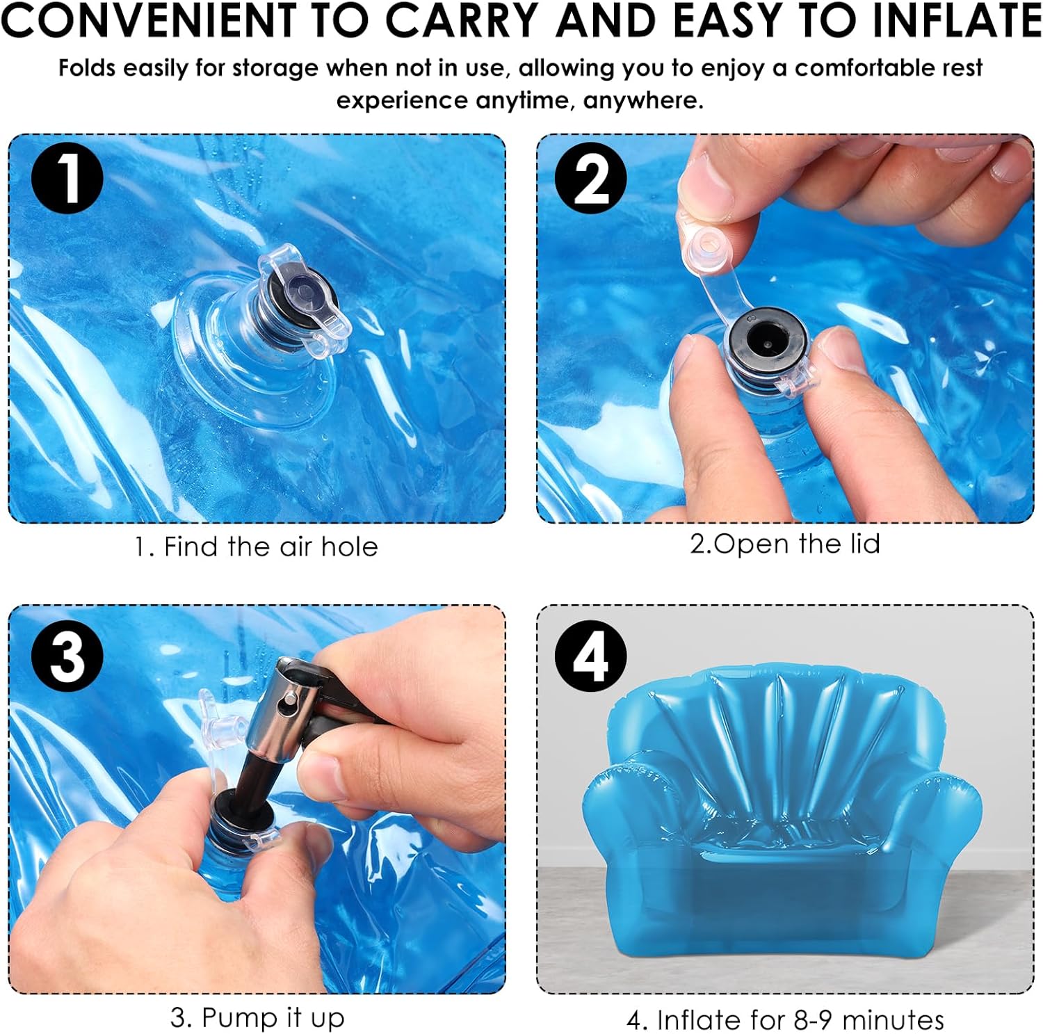 Adopt high-density 0.3mm environmentally friendly PVC soft rubber material, pass safety certification, non-toxic and odorless, load-bearing up to 150kg, stable and durable. The size after inflation is 110*85*70cm, which is spacious and comfortable for one person. After deflation, it can be folded and stored in the included PE frosted zipper bag, weighing only 2kg, easy to carry, suitable for camping, travel or home leisure.