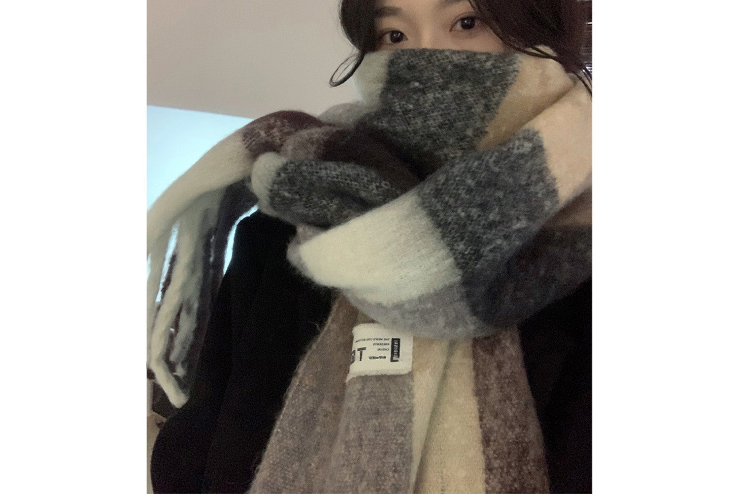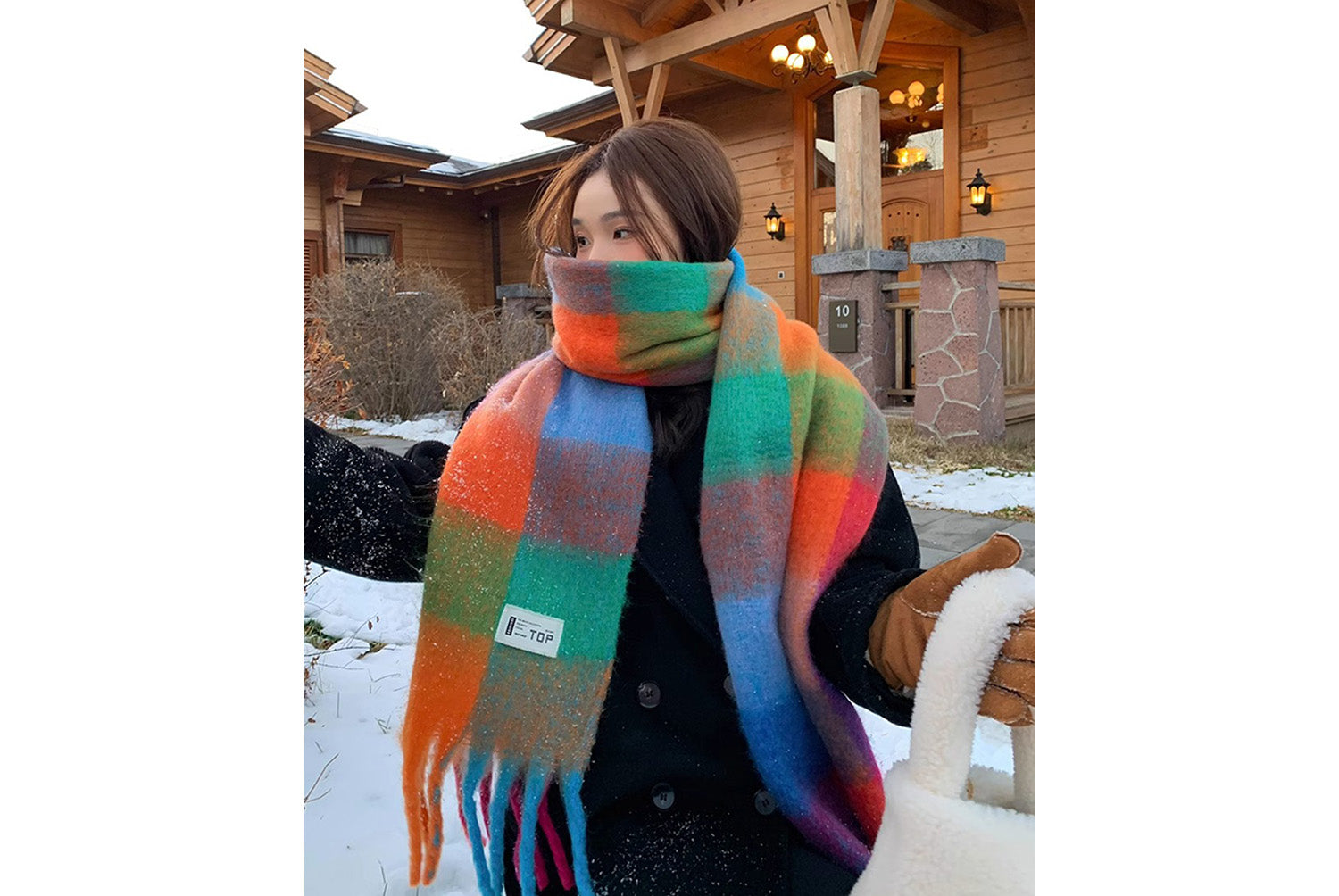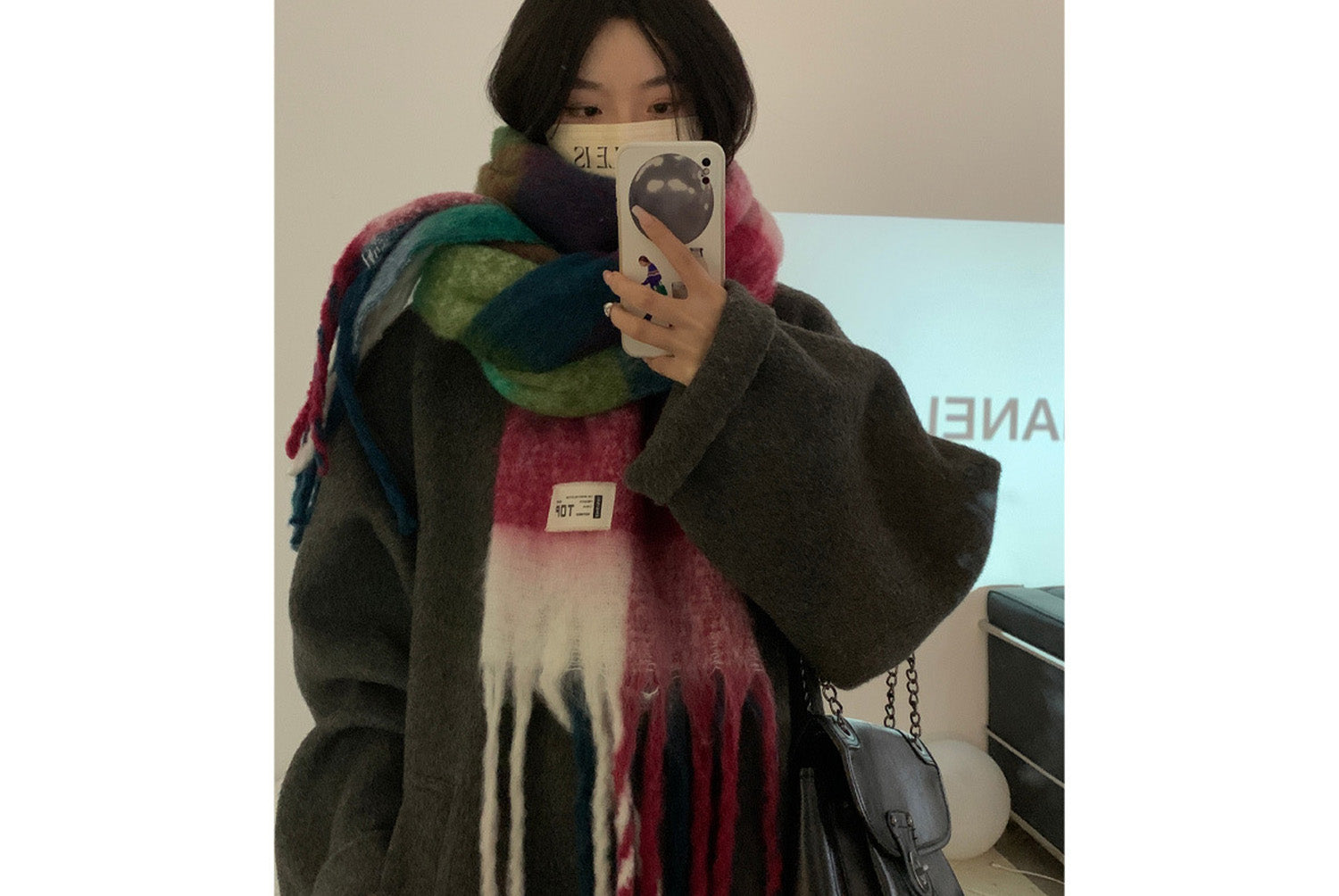 **Rainbow Color-Blocked Checkered Thick Scarf**