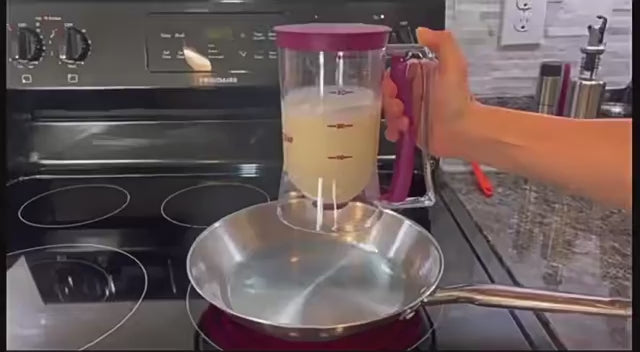 1. Pour the batter into the measuring cup, hold the dispenser and slowly squeeze it into the mold.