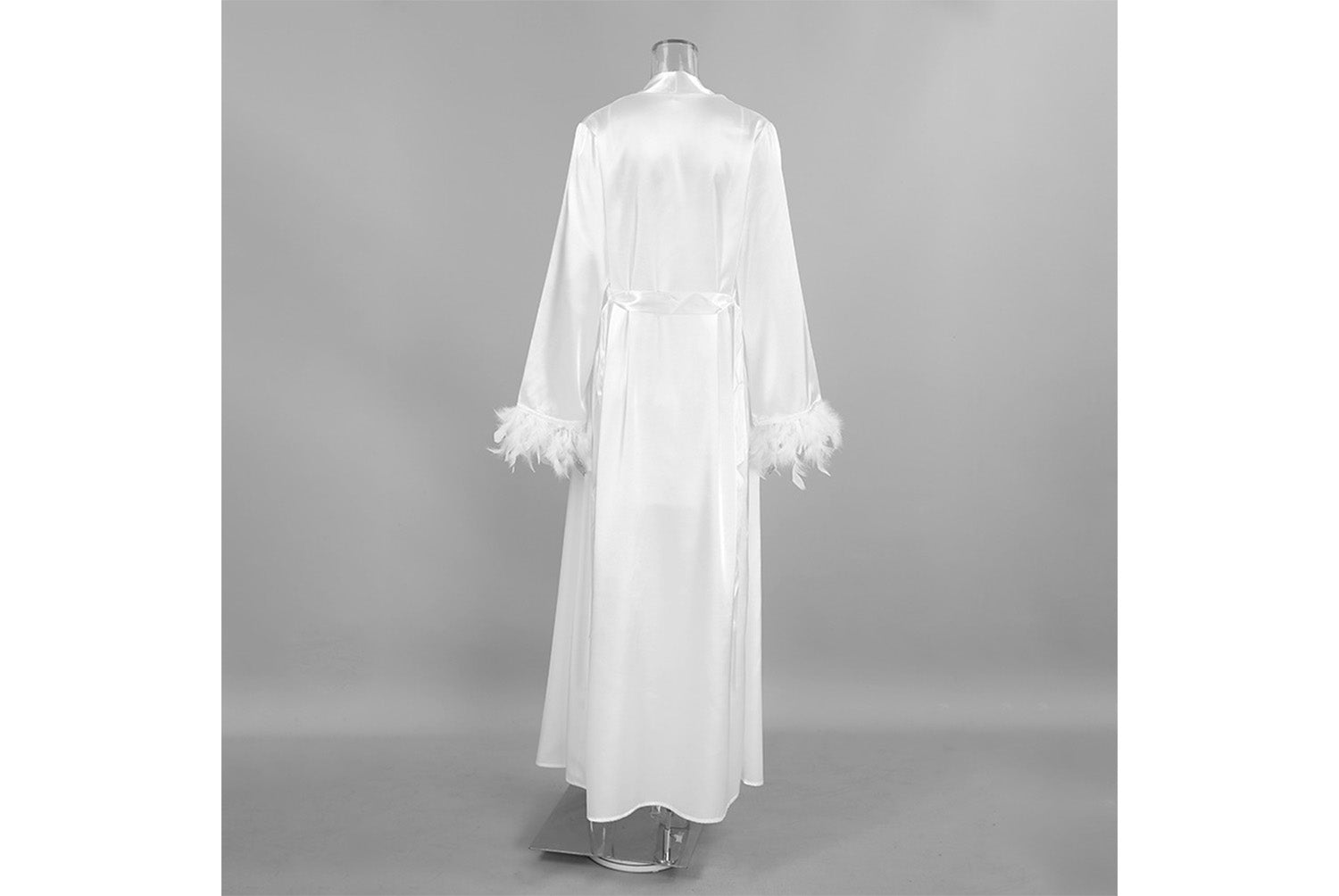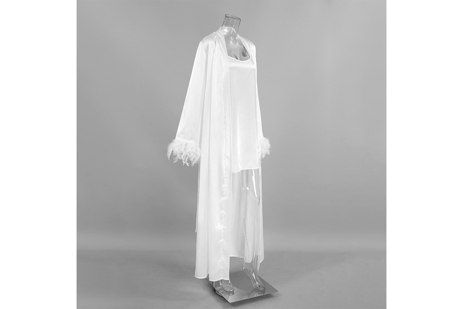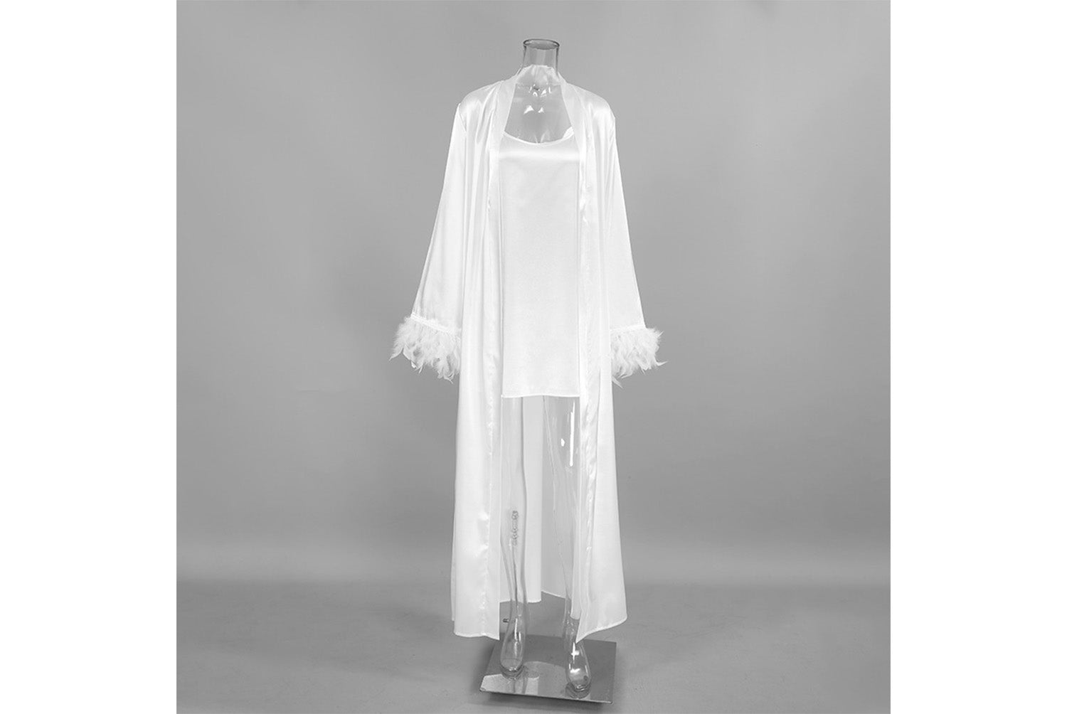 - Two-piece design consisting of a suspender nightdress and a long-sleeved feather robe