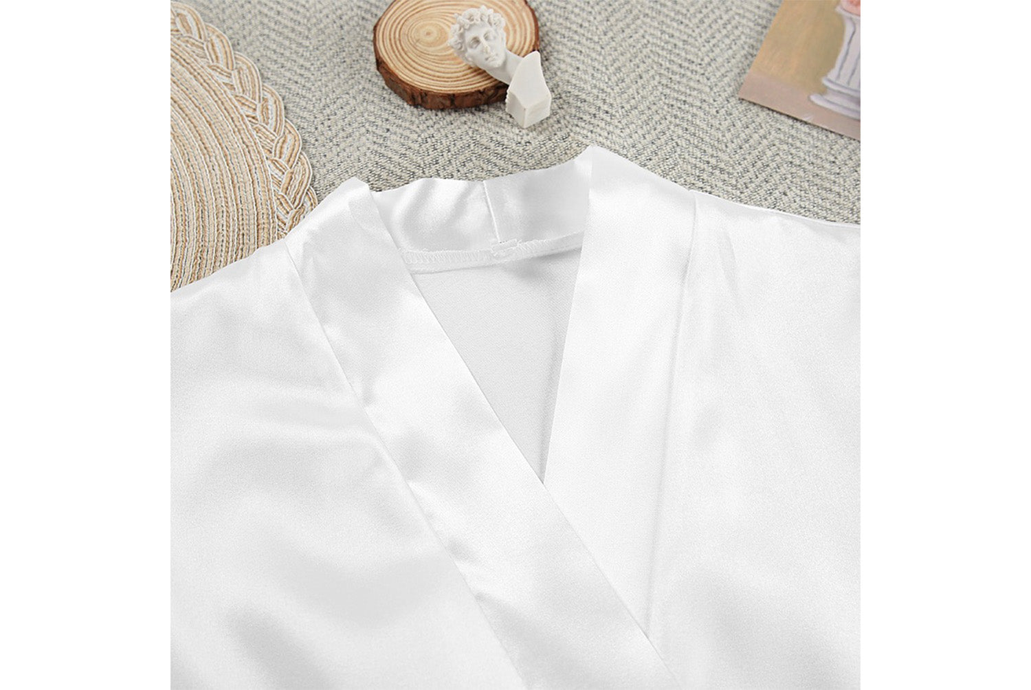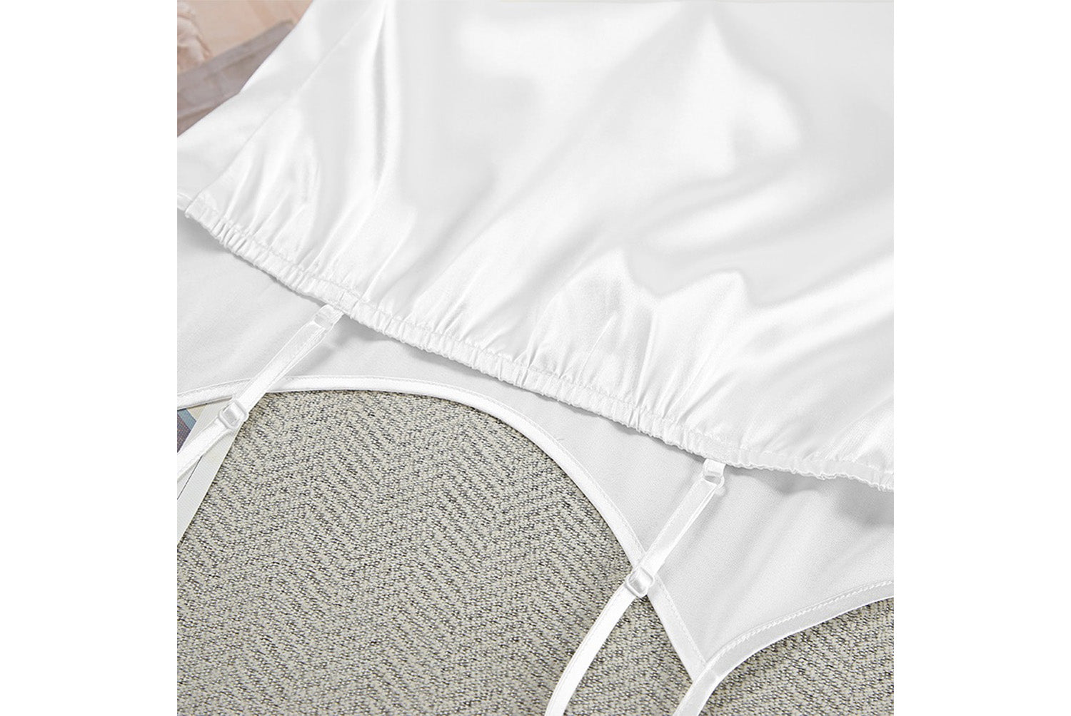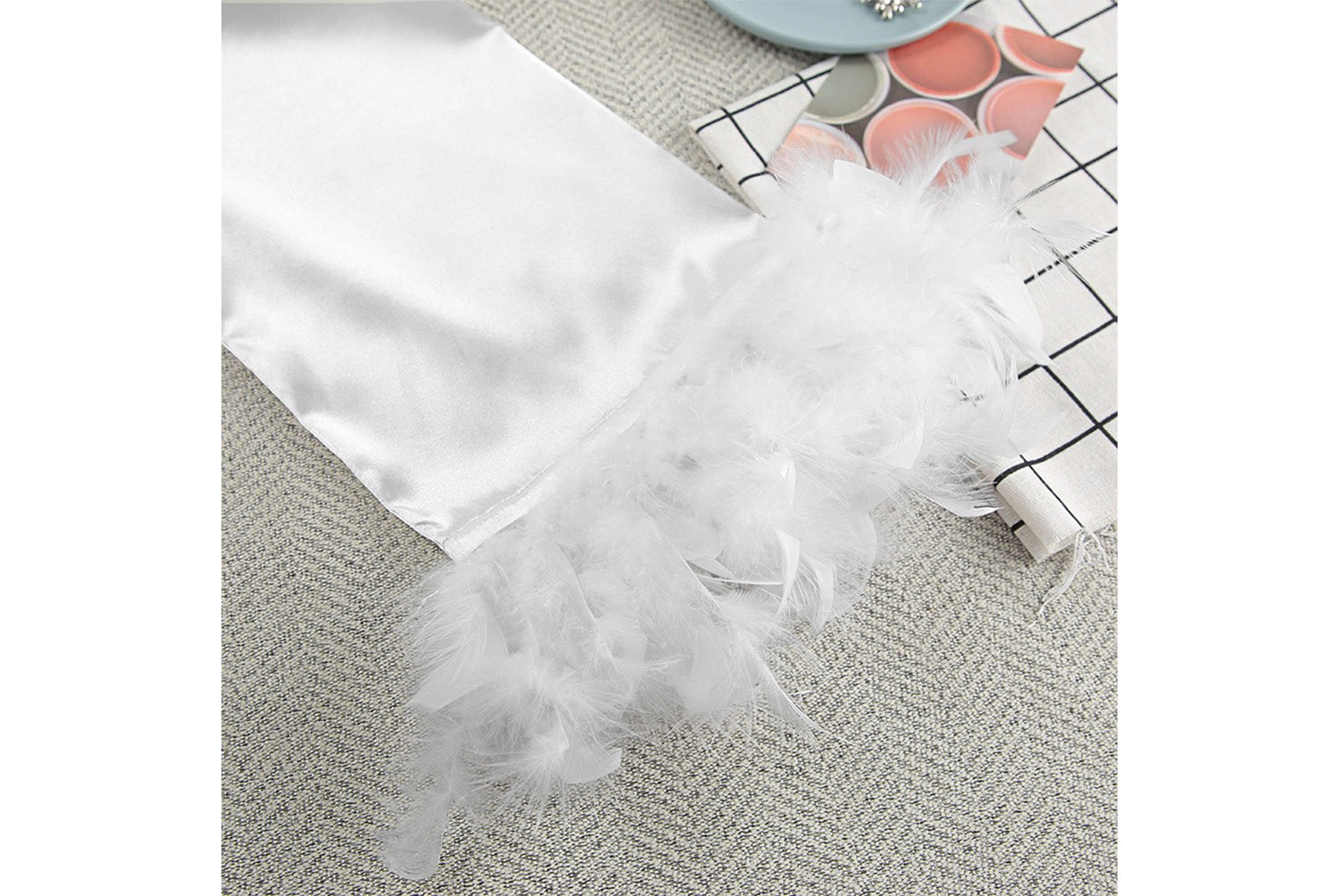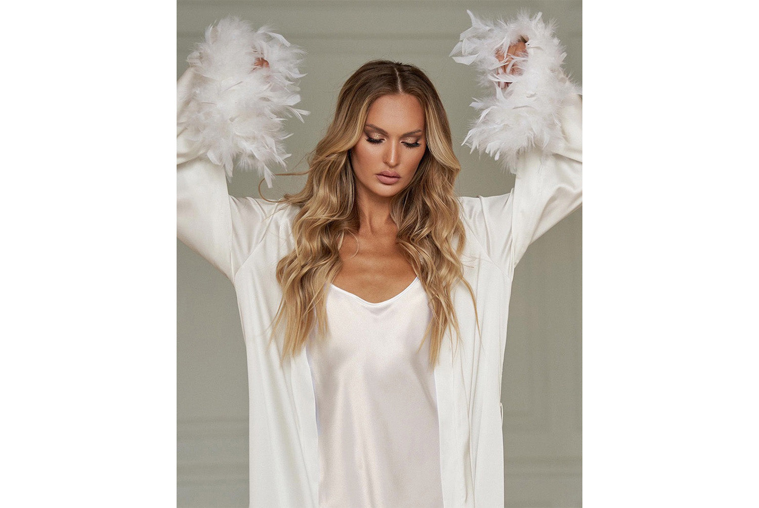 - Two-piece design consisting of a suspender nightdress and a long-sleeved feather robe