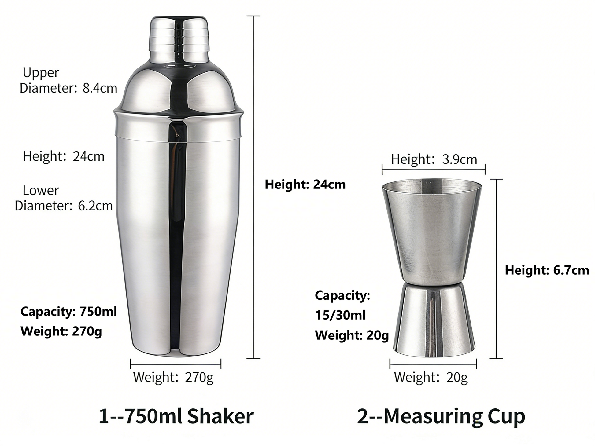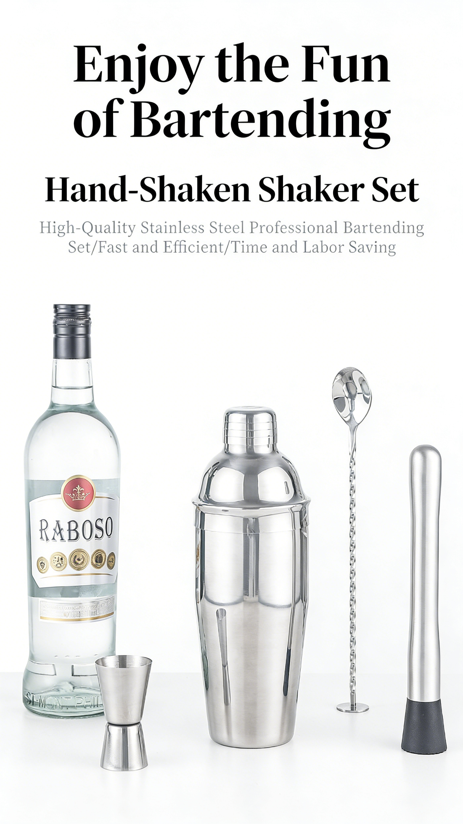 - The set includes a 750ML shaker and matching bartending tools. The main body is made of stainless steel, with a bamboo stand for durability and a natural feel.