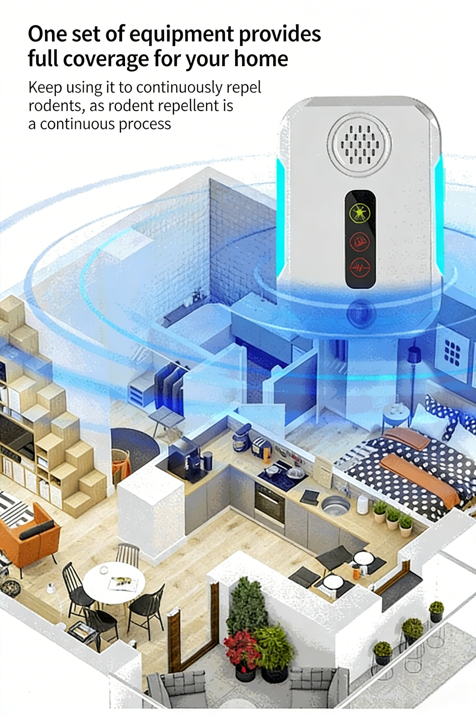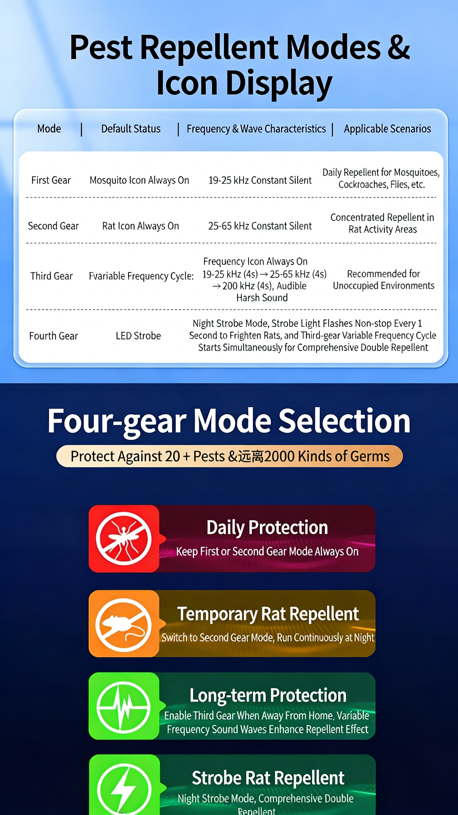 1. This product is an ultrasonic rodent repeller, a high-tech, powerful rodent-repelling device, combining two functions in one.
