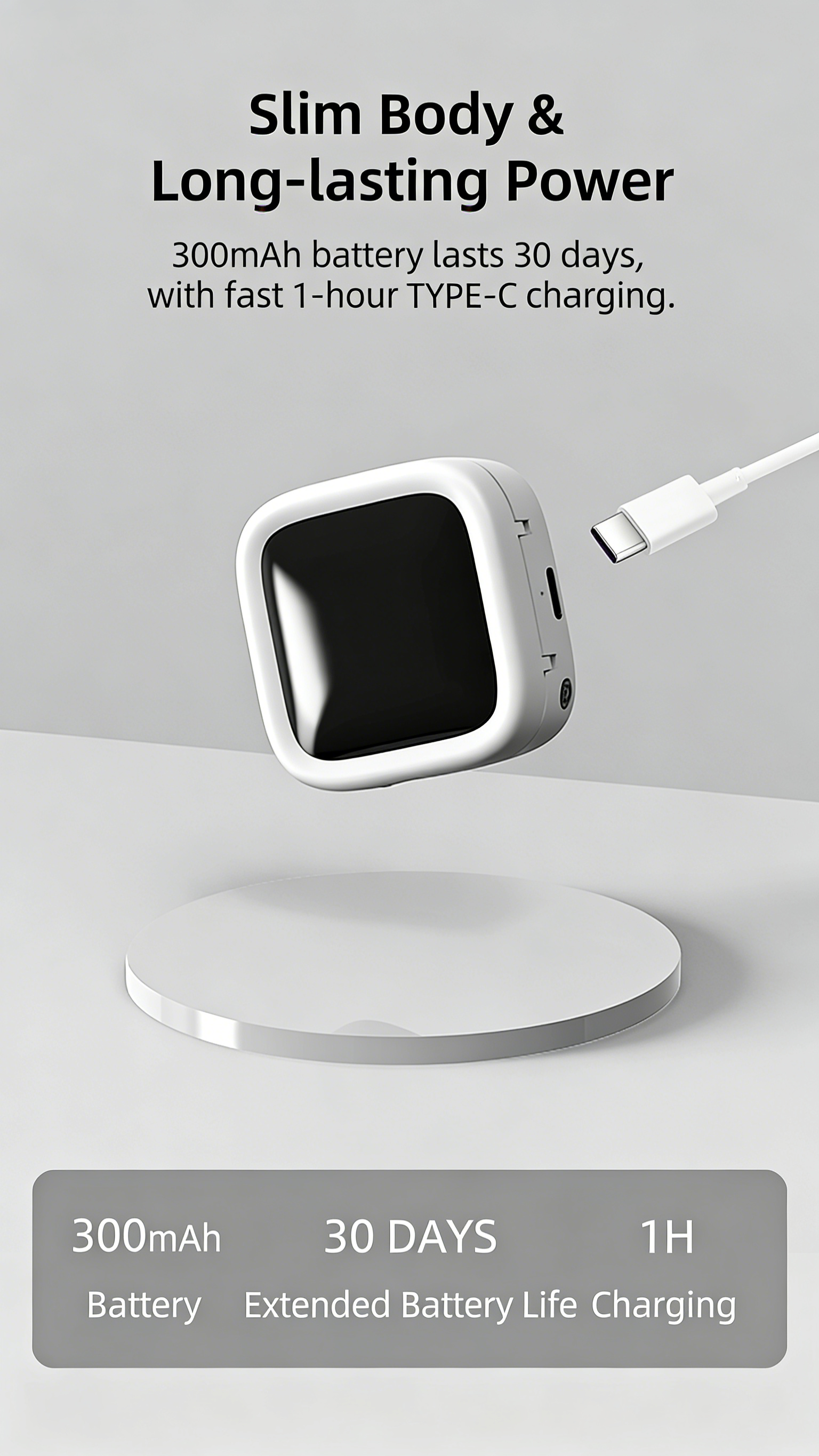 - Built-in 3.7V/300mAh battery, supports TYPE-C charging (input DC 5V 0.5A), 3W operating power, energy-efficient.