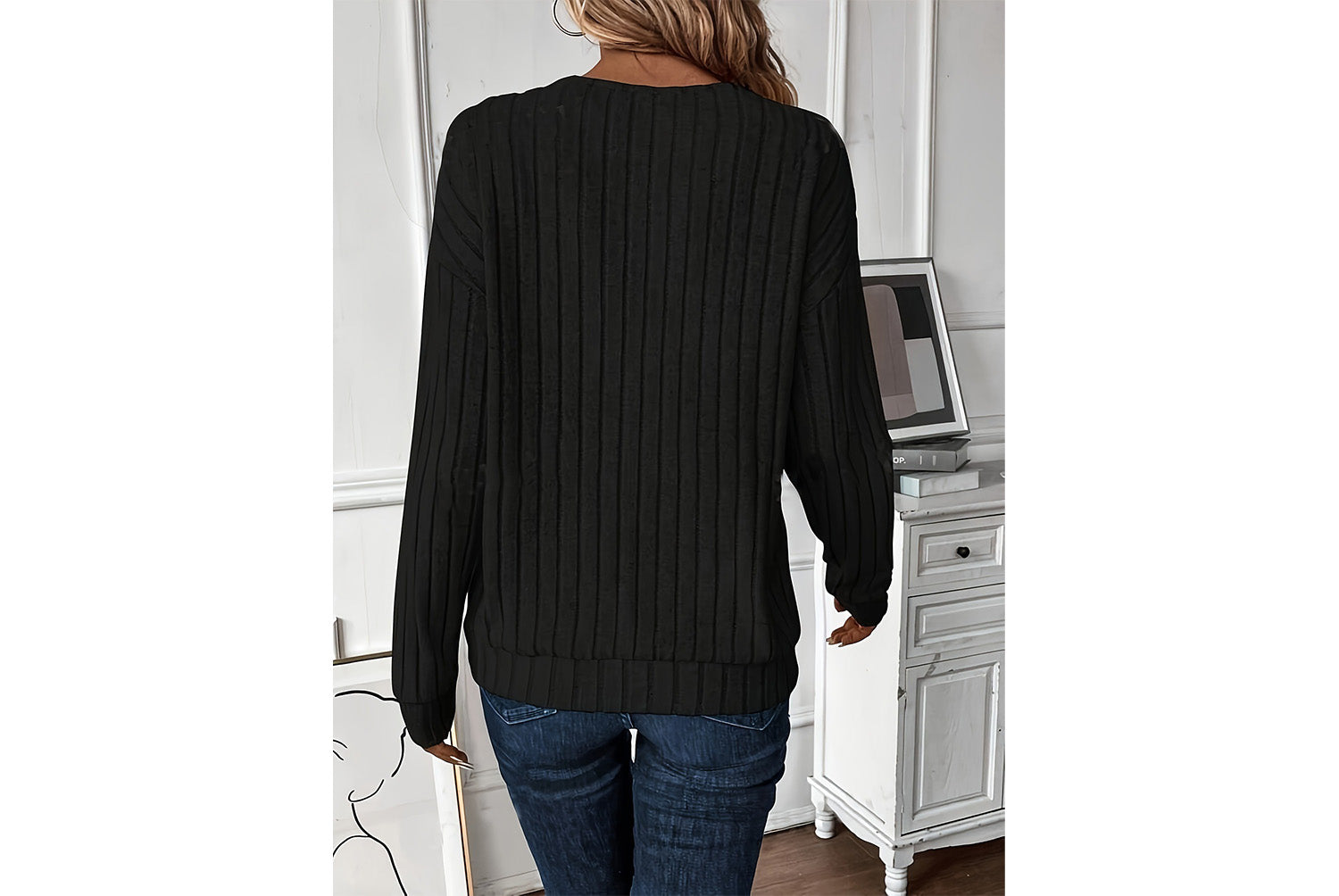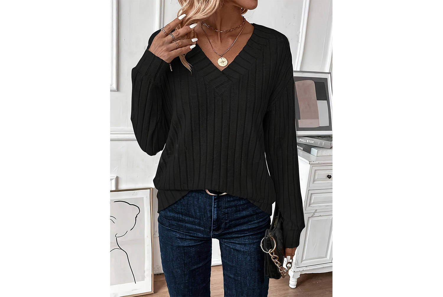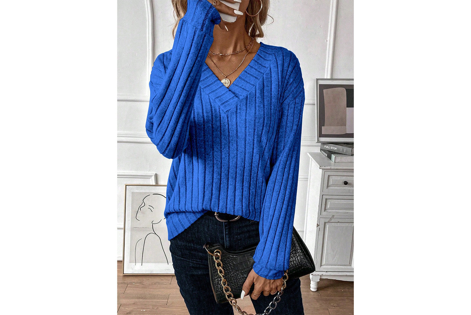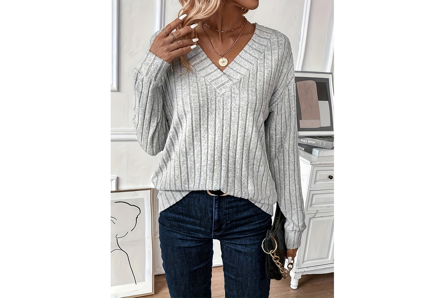 **V-Neck Ribbed Long-Sleeve Top | Loose-Fitting Casual Women's Wear**
