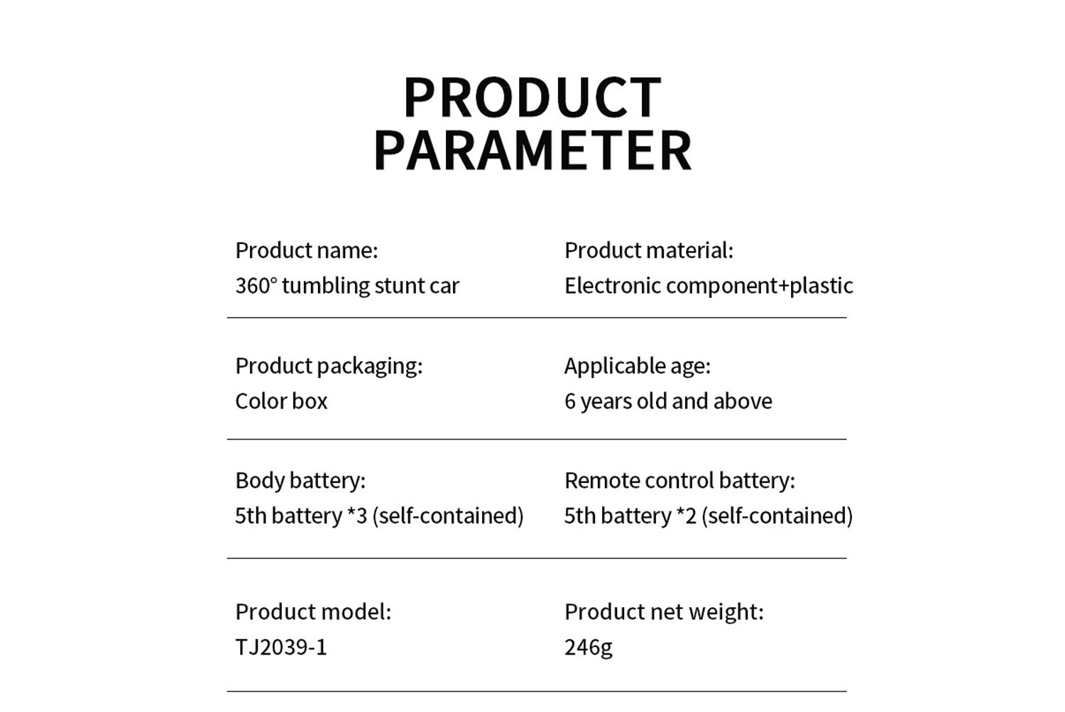 - Power Configuration: Requires AA batteries (3 for the vehicle body/2 for the remote control)