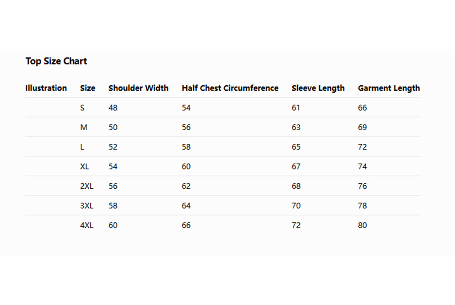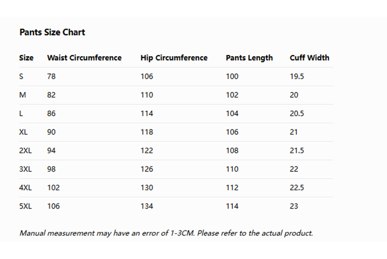 S, M, L, XL, XXL, 3XL, 4XL, 5XL